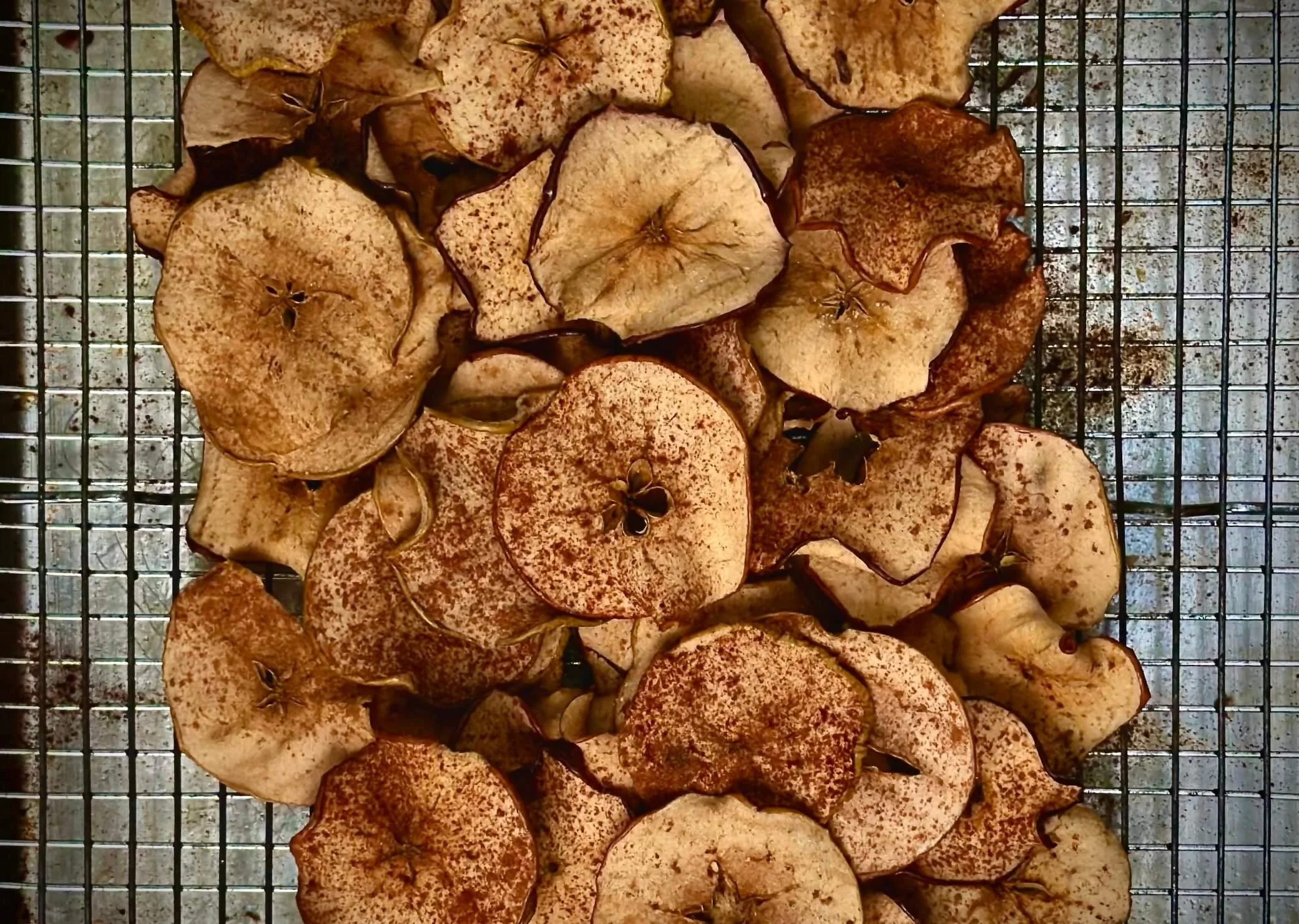 Starting at the base of the apple, use a mandolin to carefully cut the apple into 1/8-inch circles. Spread the slices across the racks in a single layer, without overlapping. Sprinkle half the sugar and cinnamon over the top of the apples. Turn them over and sprinkle with the remaining sugar and cinnamon. Bake between 2 ½ to 3 hours, until apples are dehydrated and starting to crisp. Cool and store in an airtight container for up to one month.