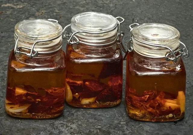 Infused oils are a rich smokey condiment that can be enjoyed as a dip or drizzled over pizza, vegetables or noodles. Oils made with fresh peppers last around a month, while dried peppers have the advantage of a longer shelf life. To increase the heat, add more peppers or break them into smaller pieces.