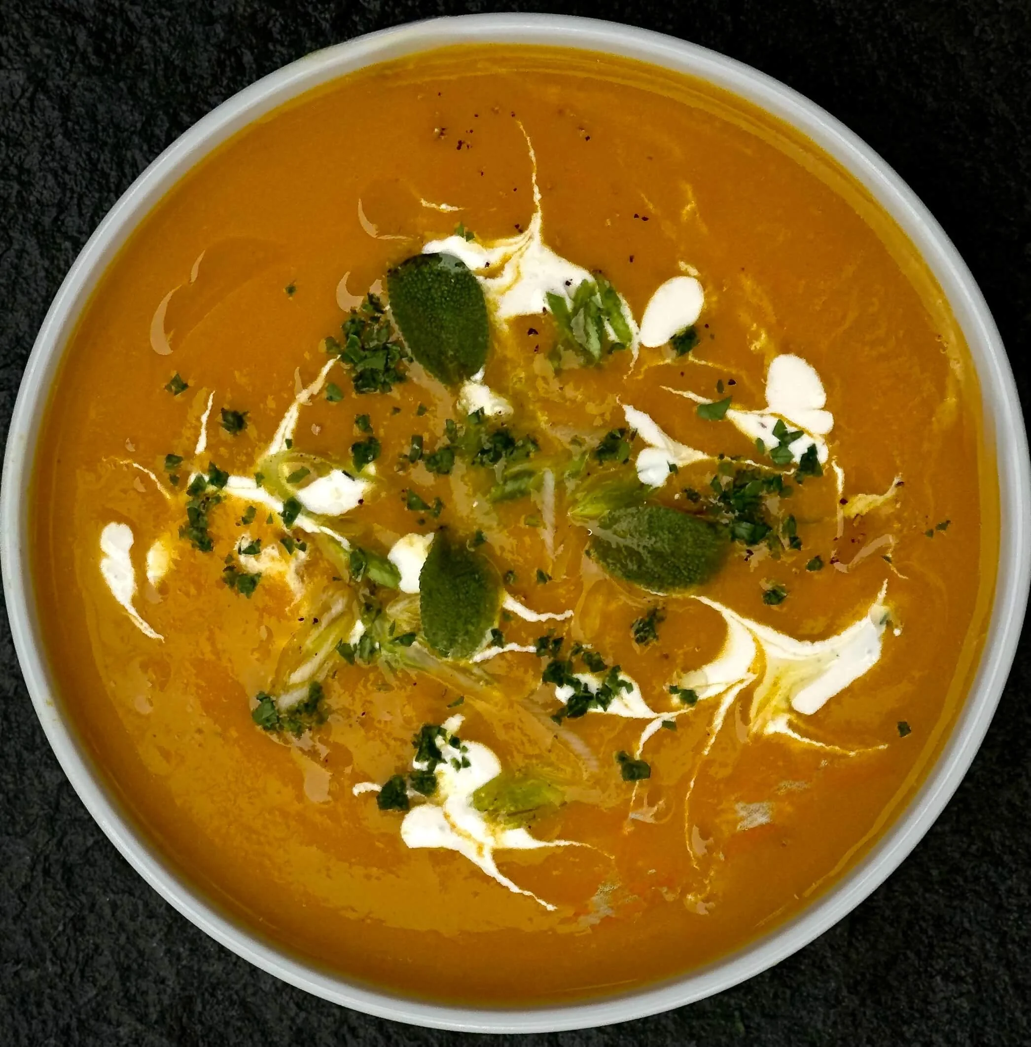This seasonal butternut squash soup is creamy, comforting, and can make well in advance and frozen. It’s topped with a decorative cider-infused cream and herbs that makes an elegant impression on any holiday table. Try making a big batch early to freeze and serve throughout the holidays and the chilly months that follow.