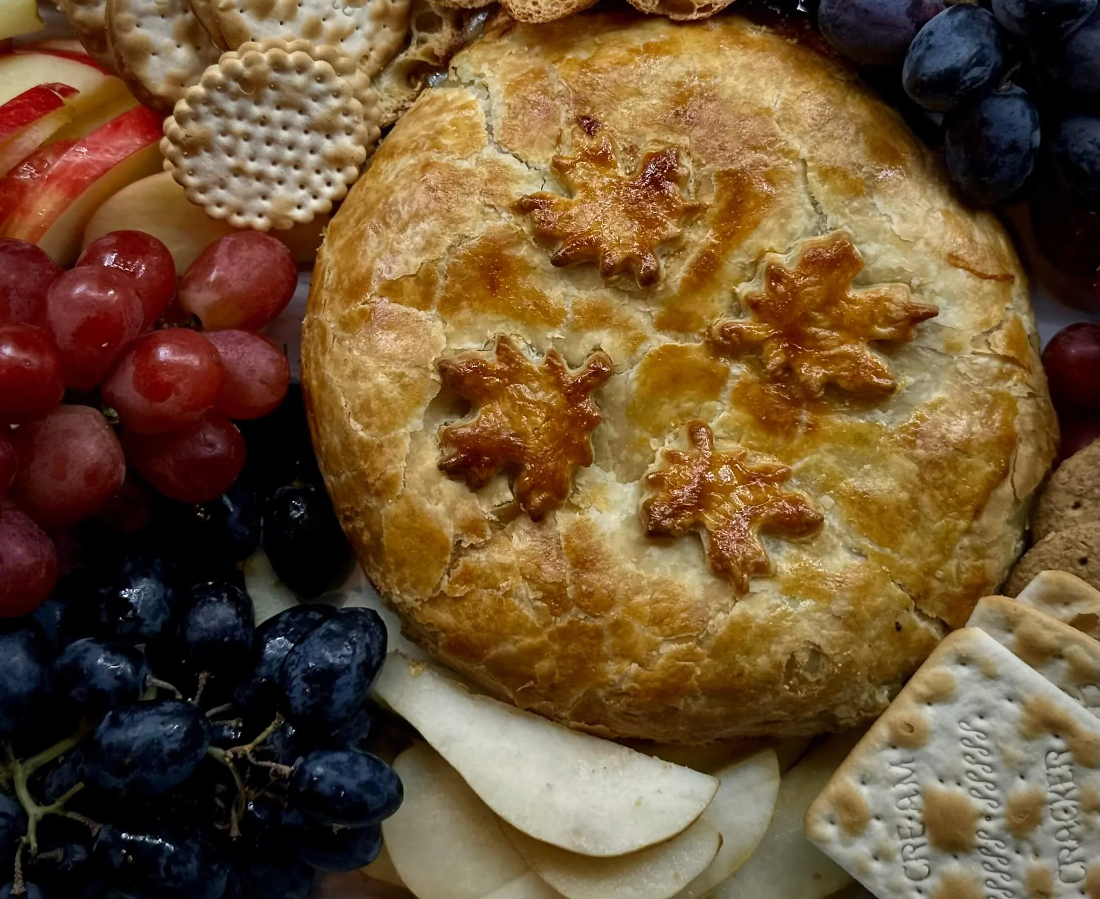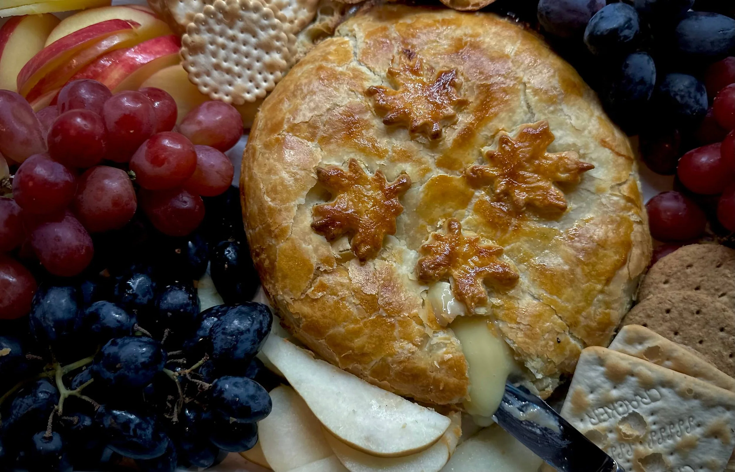 The dough is wrapped around a wheel of brie that’s been halved horizontally and filled with dried cherries, brown sugar, thyme and pistachios. It comes out of the oven puffed, golden and bubbling. Serve with fresh fruits, crackers and breads.