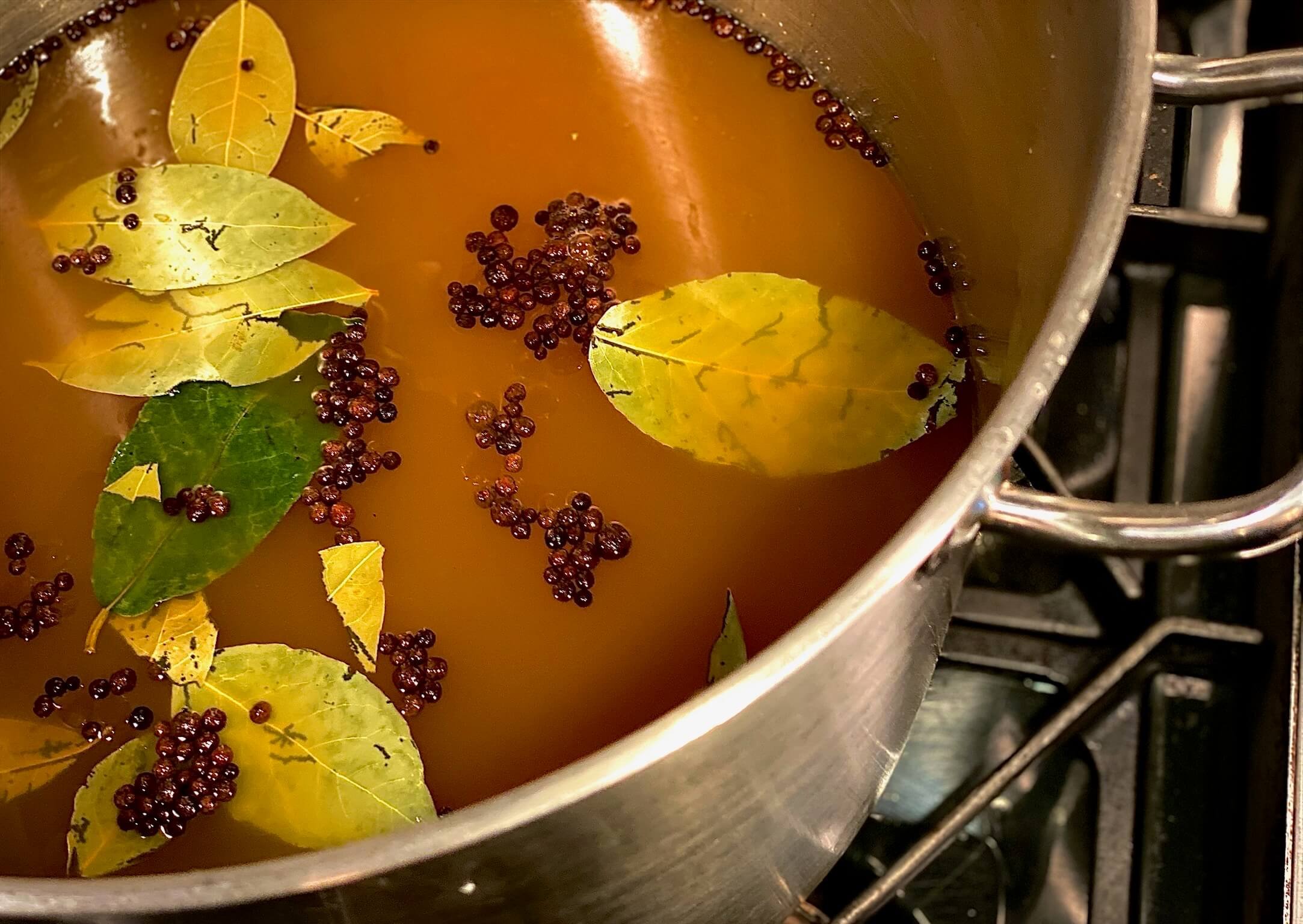 Brines can be made in a large pot on the stove by briefly boiling some water, sugar, spices, and aromatics. Once the base has cooled, more water is added to the pot to dilute the solution before the turkey can be submerged. They are stored together in a large container, bucket, or bag in the refrigerator between a few hours and up to overnight, depending on the size of the item. Seasonings in brines can be changed to flavor and tenderize a variety of different proteins like fish, pork, and poultry.